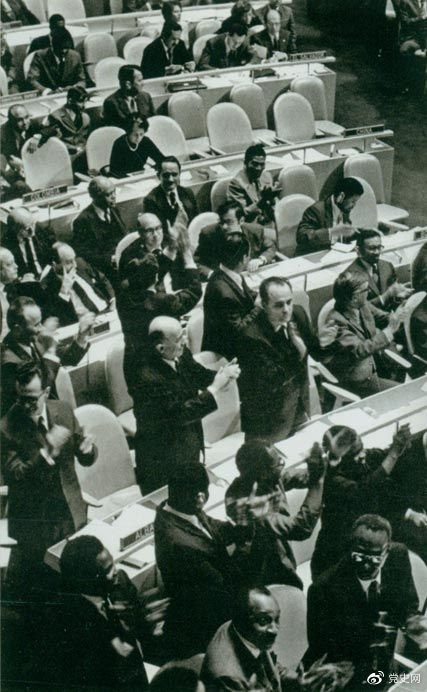 1971年10月25日,第二十六屆聯(lián)合國(guó)大會(huì)通過(guò)決議,恢復(fù)中華人民共和國(guó)在聯(lián)合國(guó)的一切合法權(quán)利。圖為決議通過(guò)時(shí),會(huì)場(chǎng)一片歡騰。